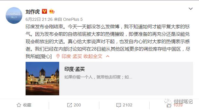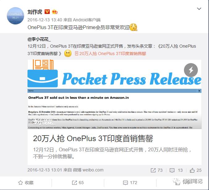 这时,国内的用户应该看不到这些外媒的评论,我们看到的是来自刘作虎个人微博上关于国内市场的火爆。6月22日,在电商平台上销售的一加5,显示预约量超过100万。刘作虎在微博上的留言是:“已经过100万了。”