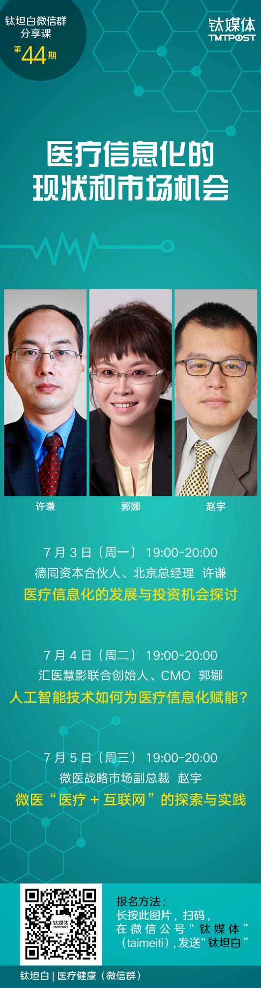 三位钛客+三天精彩分享+垂直人群深入交流。不仅如此,下期——钛坦白第45期,将再邀请三位专家,分享对“医疗信息化的现状和市场机会”的看法,并与大家交流,请期待~
