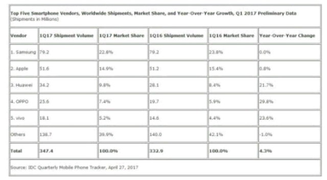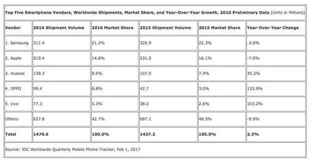 在智能手机的全球销量上,我们取两个时间段来做为衡量对象,一是2016年全年智能手机销量,二是2017年第一季度智能手机销量(因为第二季度的整体销量尚未出炉)。我们以业内公认比较权威的IDC数据来看一下,二者在这方面的整体表现。