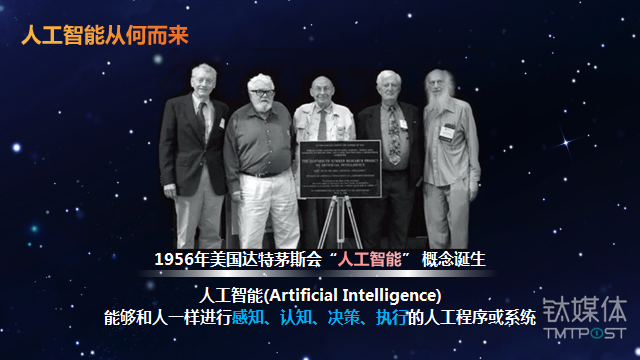 Artificial Intelligence这个概念提出很久了,现在这个概念又有所延展,类似“互联网+”,有了“AI+”的概念。1946年埃尼阿克(eniac)第一台数字计算机的发明,使人工智能成为可能,哥德尔提出了计算机可以进行人工智能计算的数学基础,冯诺依曼、图灵奠定了人工智能的基础,但是由于冯诺依曼的英年早逝,导致后面说人工智能的时候,提的会比较少。