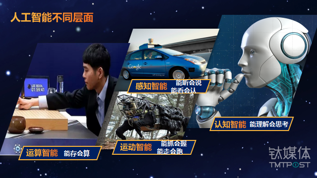 感知智能:类似于人类和动物的一些感知能力,我们叫做感知智能,包含眼耳鼻舌声等,随着传感器的发展,这块发展也会非常快。比如最近出现的自动驾驶汽车等。