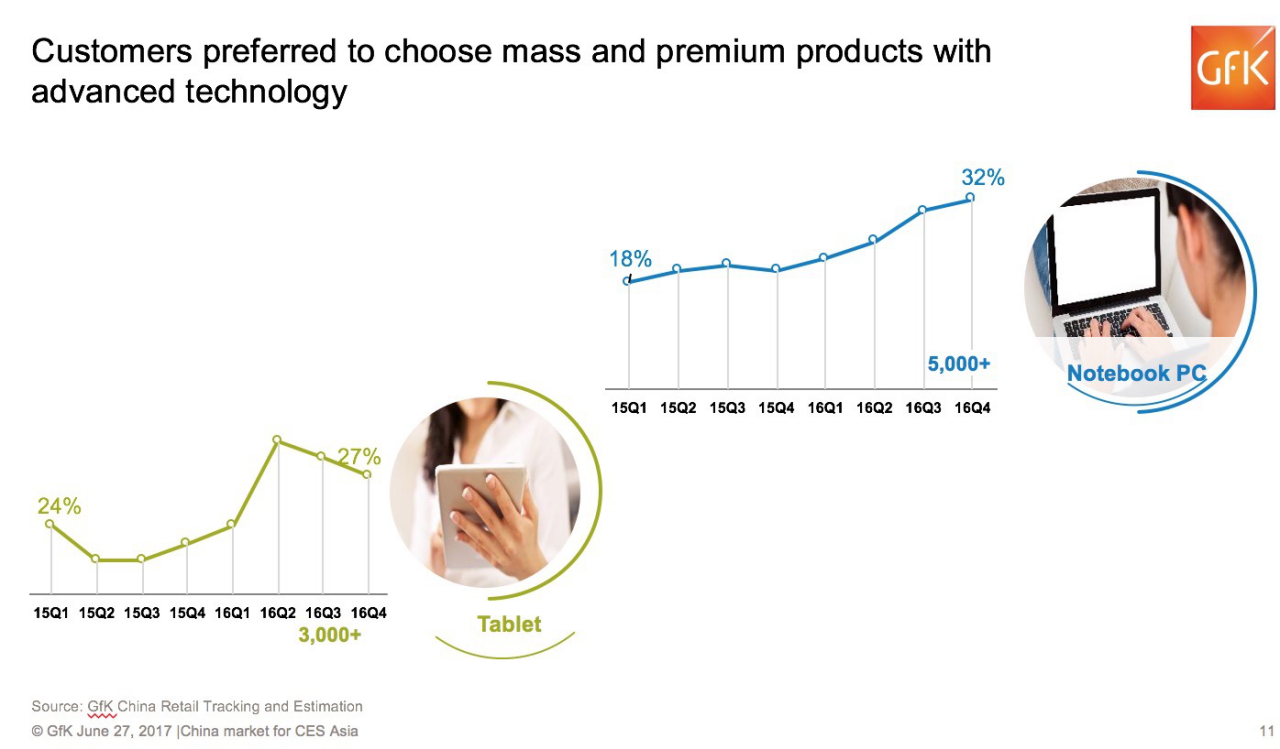数据显示,从2017年开始,6000元到8000元左右的机型,会逐渐受到消费者青睐。于此相对应的,是平板电脑在中国市场从2016年Q2开始迅速下滑。