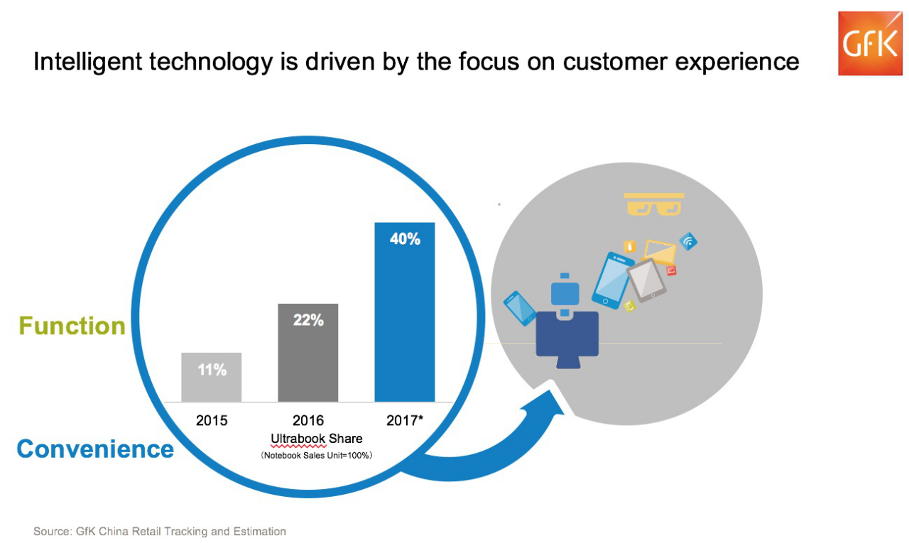 在周群展示的这张图表中,显示出这样一个亮点:超薄本将在国内市场迎来一次大幅地增长。从2015年仅占市场份额的11%,2016年占比22%,到2017年第一季度接近29%。“我们预计到2017年底,这个数字会达到40%。”
