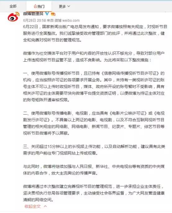 6月28日,微博再次发声,对于上传视频进行了进一步细化:对视听节目服务进行全面整改。内容涉及清理上传时政类视听节目的账号;屏蔽不合规定的电影、电视剧以及网络剧等;关闭超过15分钟以上的长视频上传功能。