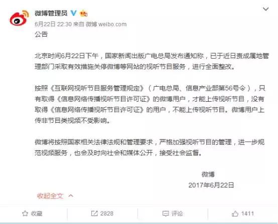 根据微博6月22日的回应,是说只有取得《信息网络传播视听节目许可证》的微博用户,才能上传视听节目,没有取得《信息网络传播视听节目许可证》的用户,不能上传视听节目,微博用户上传非节目类视频不受影响。