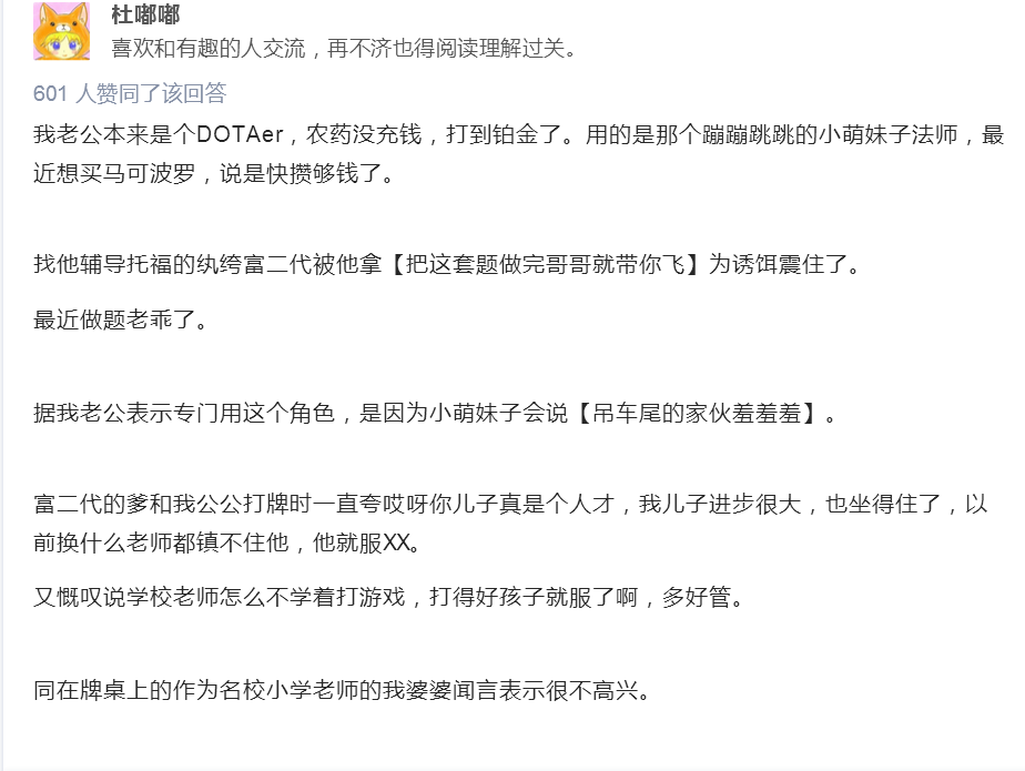 在知乎论坛上,关于孩子玩《王者荣耀》有这样一个高点赞的回答: