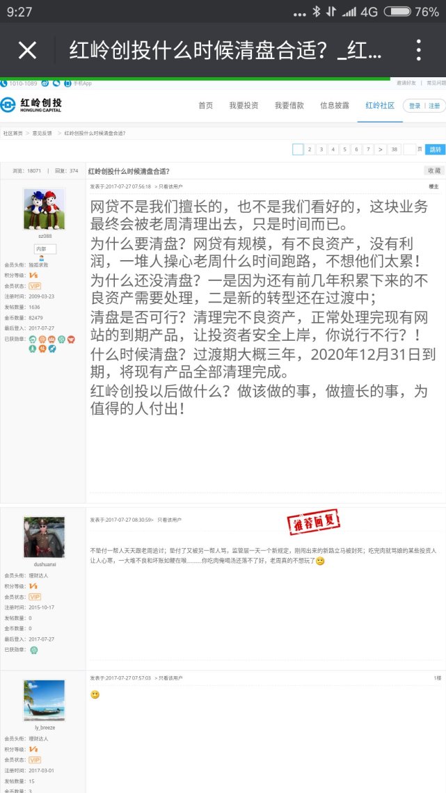 7月27日,业界知名P2P网贷平台红岭创投董事长周世平今日在红岭官方论坛以本人名义发帖称,网贷不是红岭创投所擅长的,也不是他所看好的,最终这块业务将被清理出去,只是时间而已。