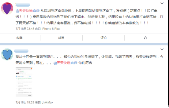 此外,还有数位用户吐槽天天快递配送员态度恶劣,不仅不送货到指定地址、让用户自取,还扬言称只服务商家不服务客户;更令人气愤的是,甚至有个别天天快递的配送员还会对用户恶言相向。