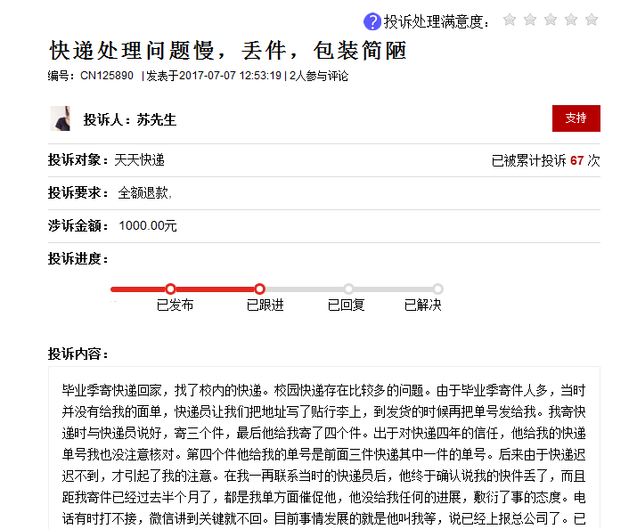 整体而言,用户对天天快递的投诉多与丢件、私拆、配送慢、态度差等有关。实际上,有关天天快递暴力分拣、私拆包裹、甚至偷拿包裹物品的情况早在2016年11月就曾被央视曝光,给社会造成较大的负面影响,该公司负责人因此也被国家邮政局约谈。