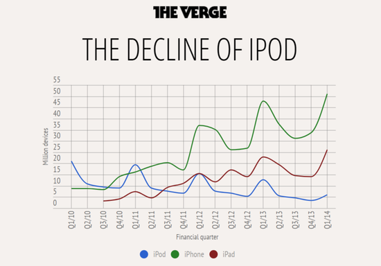 或许你是iPod死忠铁粉,还在用那几款只能下载不能在线的iPod听歌。即便这样,你也无法忽略苹果财报里的真实数据额:iPod销量已经连续四年下滑了。
