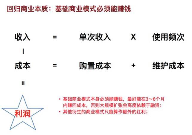 商业模式的算法很简单,收入减去成本等于利润。收入就是每天使用频次乘以单次收费;成本就是一次性购置成本,加上后面的维护成本。