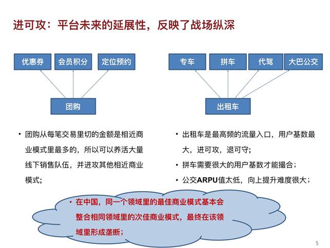 像美团、滴滴都是非常清晰的。美团是以团购为基础,做优惠券、会员积分、定位、预约,都是以核心的根据地为基础不断地画同心圆。滴滴也是,从出租车开始切专车、快车、代驾、小巴。