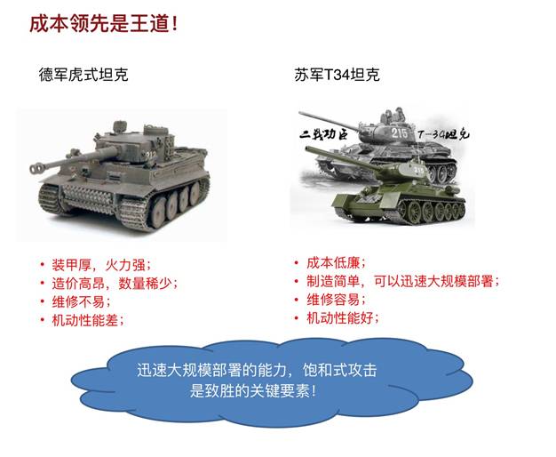 德国二次大战时的虎式坦克就是最典型的例子。它是坦克里的精品,装甲很酷,火力很强。但是没有用,造价太贵了,最终到战争结束也没生产多少辆。而且它坏了必须拉回去修,非常麻烦,机动性也差,开不快。