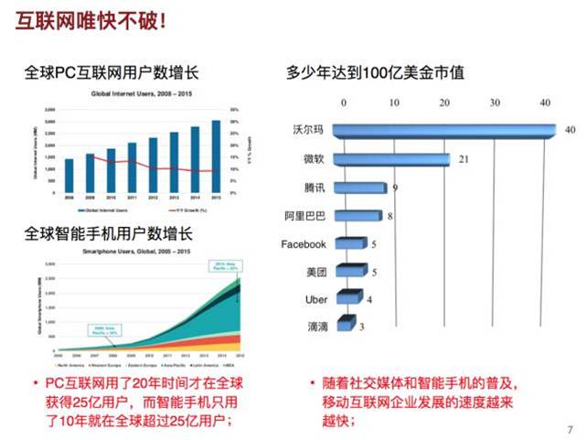 互联网必须快,唯快不破,而且速度越来越快。当年阿里巴巴花了八年时间做到百亿美金,Facebook花了五年时间,美团花了五年时间,滴滴花了差不多三年时间,ofo和摩拜都是只花了两年时间就做到了几十亿美金。
