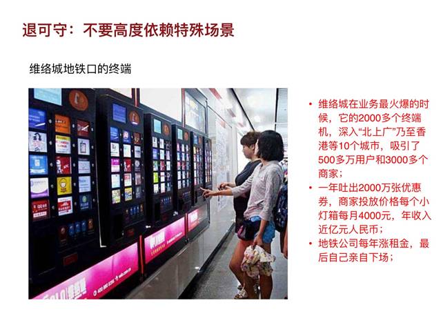 最典型的例子就是维络城。几年前,维络城做的非常成功,很多年轻人去维络城的机器上打印一张优惠券出来,去地铁周边商店消费,可以优惠。当时做到了十个城市,差不多有3万多个商户,年收入也将近上亿人民币,每年打印2000多万张优惠券。