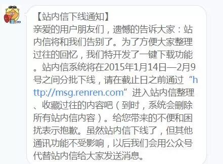 昨天上人人,突然弹出一条消息“我们很遗憾地通知您,人人站内信功能即将下线,感谢您的支持……”。人人网,这个陪伴了不少人的,我们这一代人最初的社交网络,就这样从行动上开始了最终谢幕。