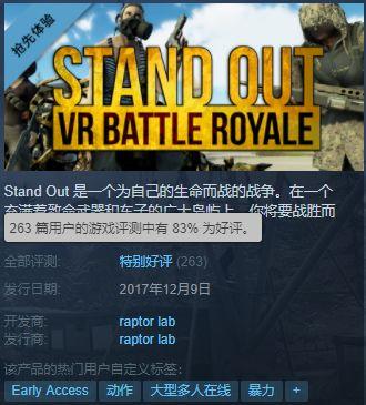 整体来说,《Stand Out》算是一款比较有诚意的VR吃鸡游戏,在游戏设计上考虑到了VR的特性,细节方面也有不少考量。《Stand Out》给玩家的感觉是,这款VR吃鸡游戏还真像回事儿,该游戏在Steam平台的评价不低。不过,缺点是《Stand Out》无法像《绝地求生》一样给玩家带来畅快的游戏体验和足够高的游戏乐趣。