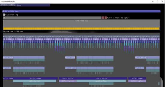 从下面你可以看到Medium的应用内分析工具。顶端的橙色条是每帧的时间,而你可以看到其相当稳定。视频中出现了多次移动操作,而每一个都需要数帧才能完成。有4个CPU线程正在进行中,以蓝色/紫色条显示。最顶端的线程是主线程,其正在持续地生成帧;后三个线程则在执行移动工具任务,与主线程异步运行,并需要数帧才能完成。它们不会影响整体的帧时间。