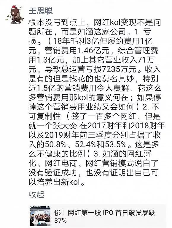 如涵上市首日股价下跌,王思聪曾朋友圈发文表达看法。