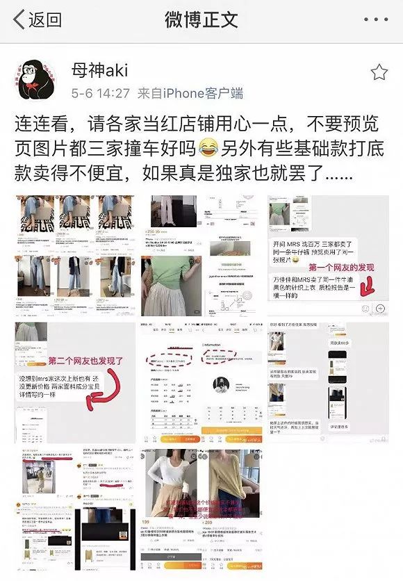 微博用户“母神aki”长年关注和收集网友曝光的网红服装店品质问题,她近一年的微博中,出现了越来越多的“款式连连看”,即数个网红服装店都在同一上新时段出现了同样的款式。