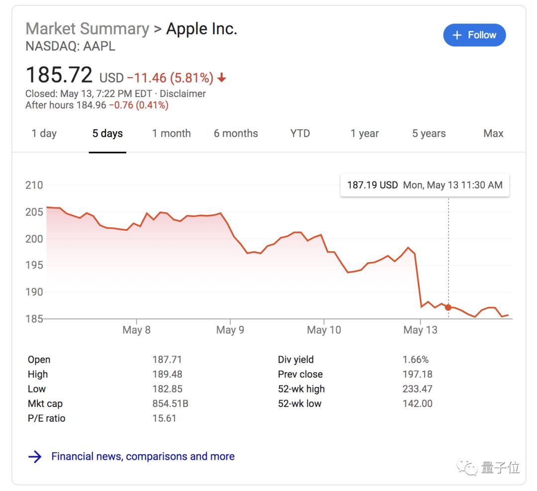 于是一夜之间,股价重挫近6%,市值蒸发580亿美元,约合人民币3894亿,相当于一个特斯拉。