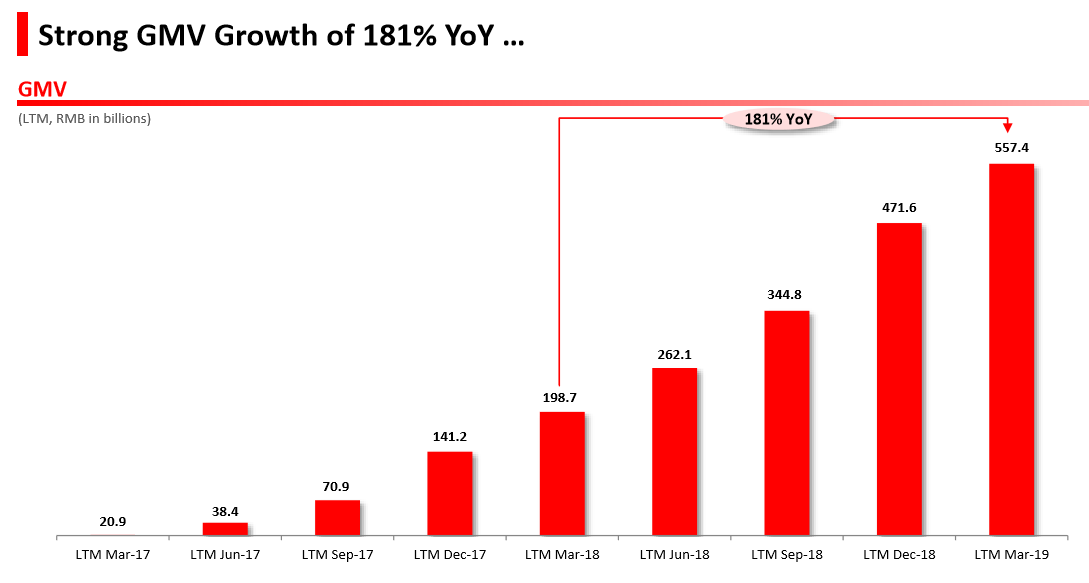 财报数据显示,截至2019年3月31日的12个月期间,拼多多平台GMV为5574亿元,较去年同期的1987亿元同比增长181%。