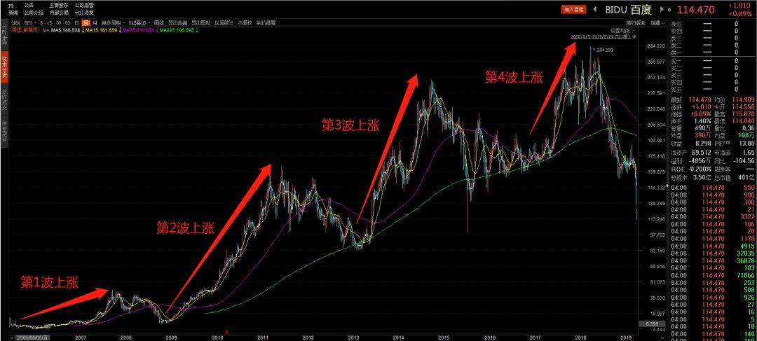 百度上市至今,市值阶段性的大幅上涨,一共有4波: