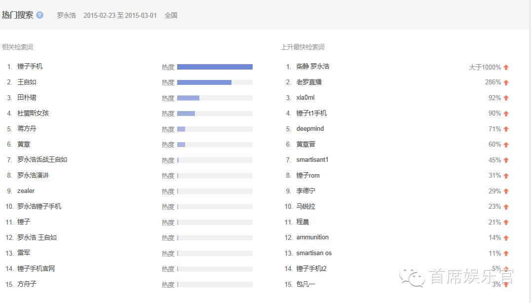 而在关键词检索上,“罗永浩、柴静”上升了大于1000%!而令人意外的是,“锤子T1手机”上升了90%,排在热搜榜第四,可见柴静事件也带动了锤子手机的热销!