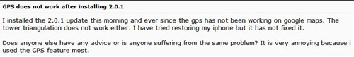 虽然新固件升级往往伴随着各种各样的问题,但iPhone2.0.1固件放出之后,用户们反映的问题也太多了点儿。在MacRumors论坛上你就可以发现网友们的怨言。值得注意的是,iPhone以往从没出过问题的GPS功能在这次固件升级之后也有人反映出了毛病,