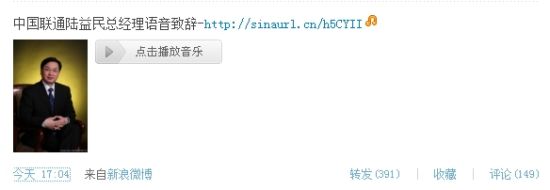中国联通总经理陆益民在联通新浪官方微博上以录音形式发表了关于“联通开通官方微博”的致辞, 此前,关于语音微博是否有前途讨论颇多。陆益民此举做了经典的示范。