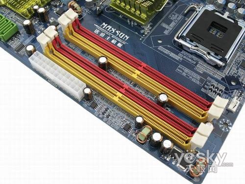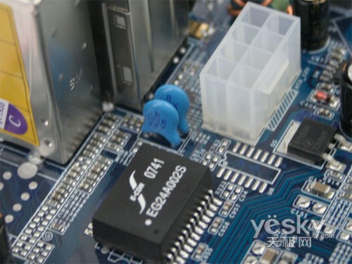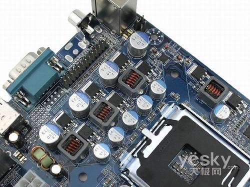 DIMM插槽部分,主板提供四条插槽,支持最高DDRII 800规格的双通道内存接入,最大内存容量8G,相信即便是高端玩家,这样的内存扩展配备也绰绰有余。在内存供电部分,采用上独立的供电部分,采用电容、MOSFET、电感三位一体,为内存的稳定/超频运行打下扎实基础。
