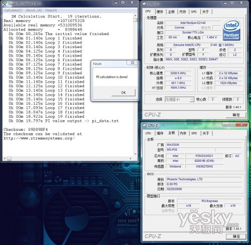 仅498元的铭瑄 MS-P35不仅拥有豪华配置,其超频性能也相当彪悍,在风冷情况下将主频仅1.6G的Intel奔腾E2140处理器超频至400MHz外频,超频后主频高达3.2G,主频和性能足足提升了一倍,性能媲美酷睿2 E6550,能直接为你省下800多元!需要注意的是,参与此次超频的E2140只是L2制程,若采用MO/最新的GO制程,超频成绩必会更好。下面带上超频成绩截图与CPU-Z认证。