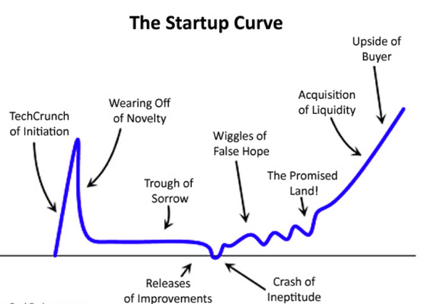 用下图来解释创业失败的心态是再好不过的了,这幅创业曲线图,或多或少地展现出一家初创公司在整个创业过程中的心态历程。如图所示,最开始,当你进入某个创业孵化项目时,热情会非常高;接着当新公司成立,新鲜感也随之爆棚,你开始适时组件团队,并开始研发产品。不过很快,新鲜感便会褪去,当梦想照进现实,你会发现运营一家初创公司有很多未曾预料到的困难,导致陷入到懊悔、后悔的深渊之中。