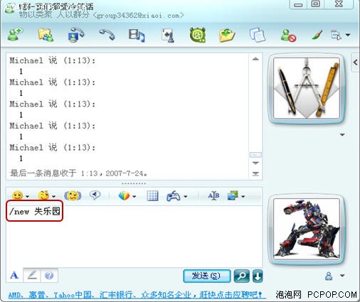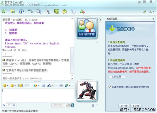 也可以用群客服机器人groupadmin@xiaoi.com创建M群。首先添加群客服机器人为MSN好友,打开该帐号的对话窗口,便可以创建群了。