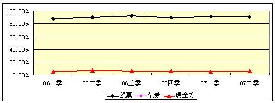 在2006年全年至2007年第二季度的投资运作期间,该基金不论股票市场行情如何振荡,根据扎实的研究、缜密的分析,始终对股票市场的后市行情保持看多的观点,六个季度里的平均股票投资仓位为90.26%,反映在附图一中,就是一根在高位走平的直线。与此同时,该基金不进行债券投资,而是在账面上始终保持高流动性的类货币资产,六个季度里的平均仓位是6.22%。这种进可攻、退可守的大类资产配置策略,对于提高该基金资产的综合运作效率起到了十分积极有效的作用。