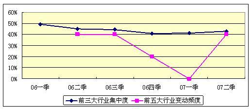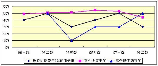 广发聚丰在个股投资策略方面一直在追求适度的积极,附图三显示,第一,在重仓股集中度方面,该基金在成立以来的多数时间里将过半数的股票资产集中投资前10只股票,只是在行情进入了2007年第二季度,当股指已经涨过了3000点之后,该基金才将前10大重仓股集中度降低到了50%以下。与此同步的是,该基金前10大重仓股中投资比例高于5%的股票数量也开始减少。第二,在重仓股变动频率方面,随着市场风险的升高,为了适应市场热点较为快速转换的需要,为了保持较好的流动性,该基金的重仓股变动频度也有了明显的提高,2007年第二季度就更换了5只重仓股。