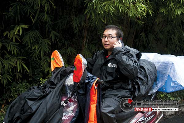 (11月15日,韶山南路,快递员刘豪冒雨通知顾客取件。)