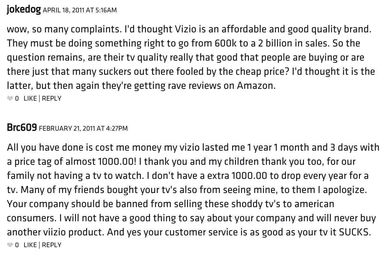 尽管在媒体上受捧,消费者的抱怨似乎是每家公司都无法避免的问题,王蔚引以为傲的客户服务也曾得到不少吐槽。有人直接放炮,“我以为Vizio是一个买得起、质量好的品牌,看来它肯定做了什么手脚才把销量从60万增长到20亿”,还有人直接感谢他全家,“谢谢你们让我家看不了电视,我们可没有钱到每年可以扔掉1000块。”(下图就是原始吐槽“凭证”)