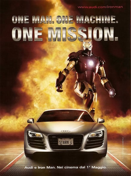 看到去年通用汽车和《变形金刚》合作的效果,今年奥迪汽车(Audi)与电影《铁人》(Iron Man)也实行了捆绑推销的策略,在奥迪的网站上专门开辟了《铁人》的专区,而且还专门制作了奥迪车的“铁人”广告: