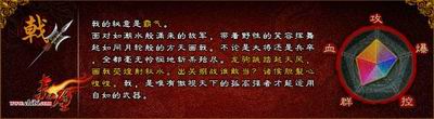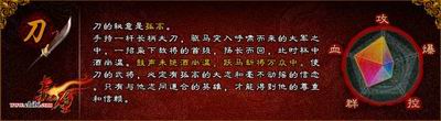 刀,作为攻击力卓越的武器之一,无论是杀怪练级,亦或是副本挑战,都将令玩家出入自如。手持一杆长柄大刀,驱马突入呼啸而来的大军之中,一招削下敌将的首级,扬长而回,此时杯中酒尚温。正所谓“鼓声未绝酒尚温,跃马斩将万众中”。关羽,使刀的武将,有孤高的大志和毫不动摇的信念。只有与他志同道合的英雄,才能得到他的尊重和信赖。人们常用“刀如猛虎”来形容刀的勇猛彪悍,雄健有力。举起刀,再世关羽就是你!